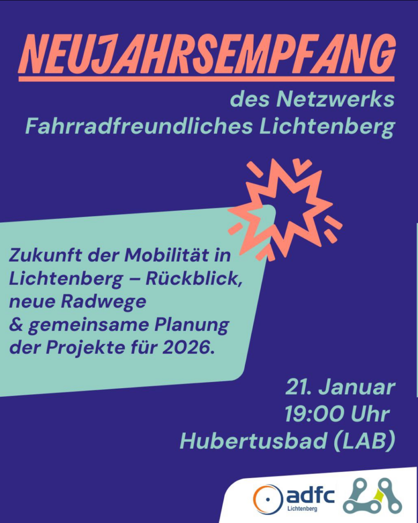 Als Netzwerk Fahrradfreundliches Lichtenberg werden wir vorstellen, wie sich in den letzten fünf Jahren das Mobilitätsverhalten in unserem Bezirk verändert hat: „Das Auto nun auf dem letzten Platz der täglich genutzten Verkehrsmittel“. Danach wollen wir einen Blick zurück ins Jahr 2025 und die fertiggestellte Radinfrastruktur werfen.